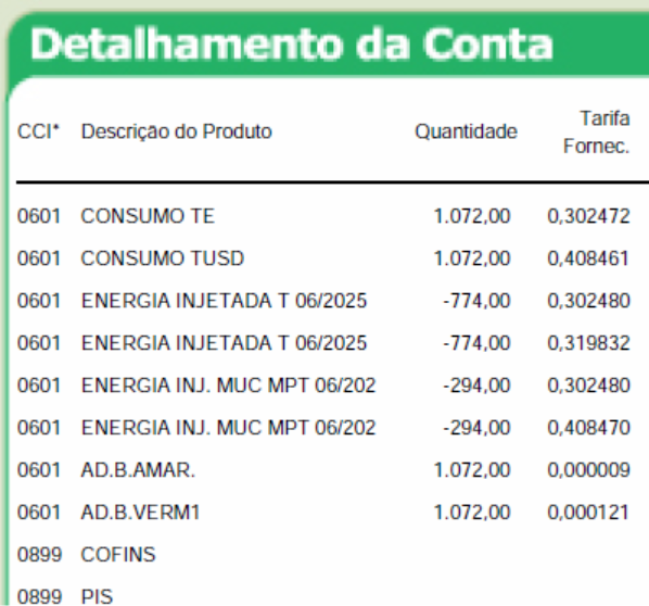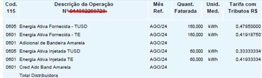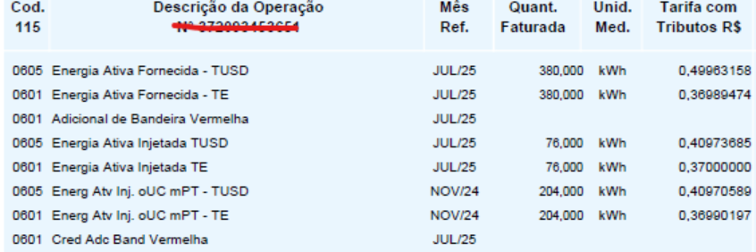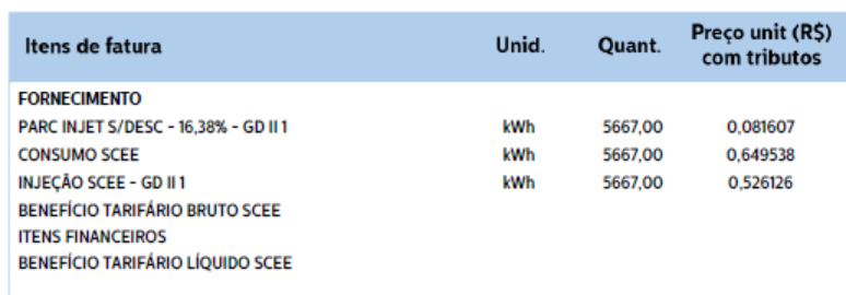 Nesses casos, é preciso comparar os valores da TUSD e da TE consumidas da rede, com os da energia injetada. Vamos utilizar essa mesma fatura como exemplo: